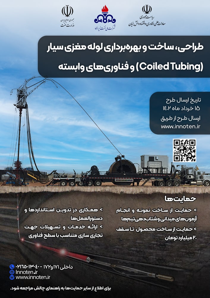 در همین راستا معاونت علمی، فناوری و اقتصاد دانش بنیان ریاست جمهوری و شرکت ملی نفت ایران به منظور ارتقاء تابآوري ملی و رقابتپذيری بينالمللی و كاهش ارزبری و وابستگی صنعت حفاری و همچنین بهرهمندی از ظرفیت زيستبوم فناوري و نوآوری، چالشی با عنوان، “طراحی، ساخت و بهرهبرداری لوله مغزی سیار و فناوریهای وابسته” را مطرح نموده و از طرحهای فناورانه و نوآورانه در این زمینه حمایت مینمایند. بدین منظور از نخبگان، صاحبان ایده و شرکتهای دانش بنیان وفناور کشور دعوت می نماید تا طرحهای خود را با توجه به رویکردهای پیشنهادی ذکر شده از طریق سایت Innoten.ir ارسال نمایند.